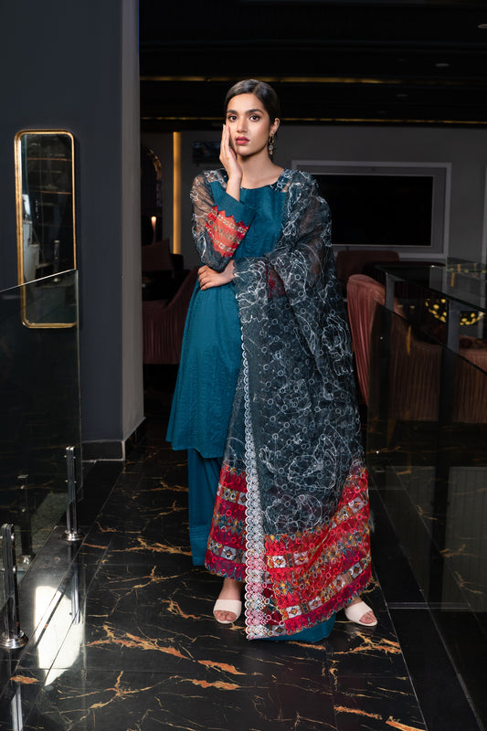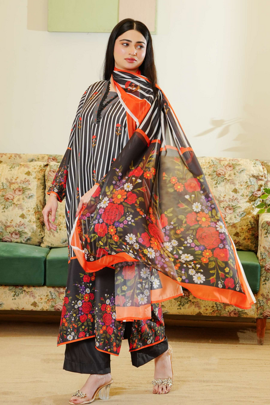 3-Piece Embroidered Black Suit with Organza Dupatta